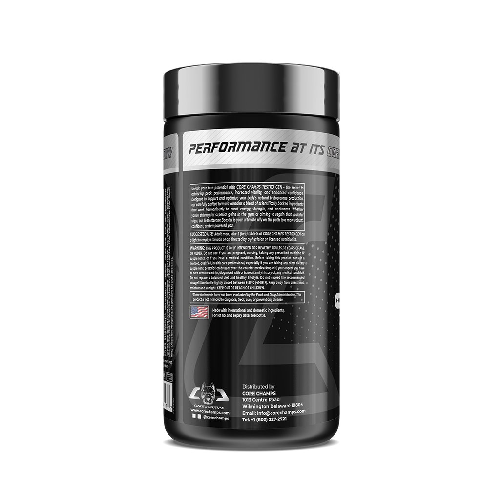 CORE CHAMPS TESTRO GEN – the secret to achieving peak performance, vitality, and confidence. Designed to support and optimize your body's natural testosterone production, carefully crafted formula contains a blend of scientifically backed ingredients that work harmoniously to boost energy, strength, and endurance.